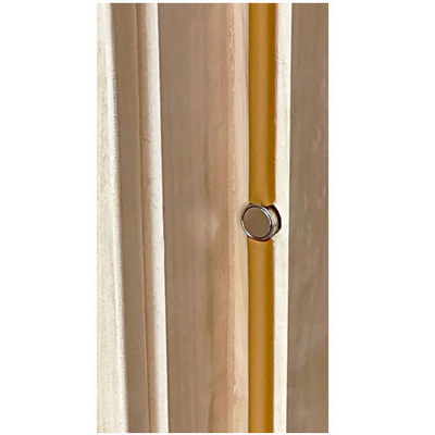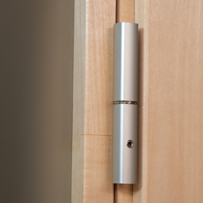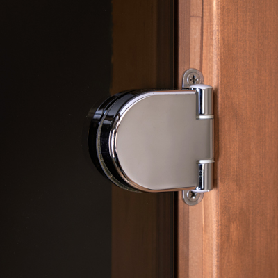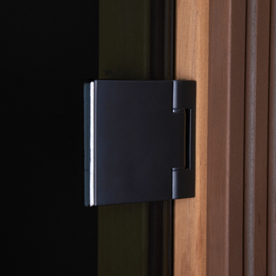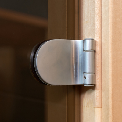 Для обеспечения легкого хода и прямолинейной геометрии несущей стоевой части дверного полотна мы установили три дверных петли итальянской фирмы Otlav, которые выполнены в устойчивом от корозии исполнении и имеет возможность регулирования в трех плоскостях, что очень важно для точной регулировки примыкания дверного полотна к силиконовому уплотнителю, который вмонтированный в дверную коробку. С противоположной части дверного полотна имеются две устойчивые к корозии защелки немецкой фирмы Aubi одна по центру, а другая в самой высокой точки дверного полотна. Благодаря использованию трех петель и двух защелок мы добились идеальной герметичности деревянных дверей в сауну или баню, что сняло все проблемы, которые ограничивали использования деревянных дверей в сауну или баню, так как при использовании классической схемы деревянных дверей при длительной эксплуатации верхняя часть дверного полотна под действием отжимной силы резинового уплотнителя и высокой температуры и влажности начинает отгибаться на внешнюю сторону, создавая не герметичность при примыкании двери к уплотнителю.