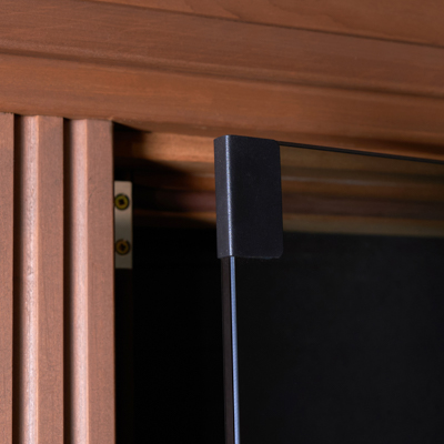 Коробка для деревянных и стеклянных дверей в сауну или баню для снятия напряжения, который возникает при больших перепадах температуры и влажности, тоже склеивается из коротких деталей, как в длину, так и в толщину. По периметру рамы имеется паз, который вставляется в силиконовый высоко-эластичный уплотнитель производство Германии, который выдерживает температуру 300 градусов. Обрамление двери имеет систему шип-паз с удлиненным шипом специально разработанным для дверей, эксплуатируемых в саунах или банях. Для дополнительной прочности для обрамления двери по углам дверного полотна вкручены шурупы длиной 150мм. Стояки обрамления изготовлены из коротких заготовок древесина липа склеенных в длину на микро- шип, а также в толщину из 6 частей и дополнительно стабилизированы фасадными ламелями.